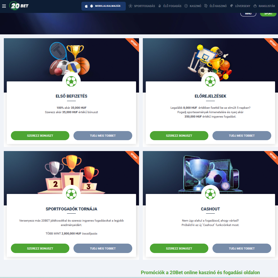 Az üdvözlő ajánlat mellett a 20BET rendszeres és speciális promóciókkal várja a magyar játékosokat. Ezek közé tartoznak a heti előrejelzések, az újratöltési bónuszok, valamint olyan funkciók, mint a cashout és a Bet Builder. Az alábbiakban bemutatjuk a legnépszerűbb lehetőségeket.