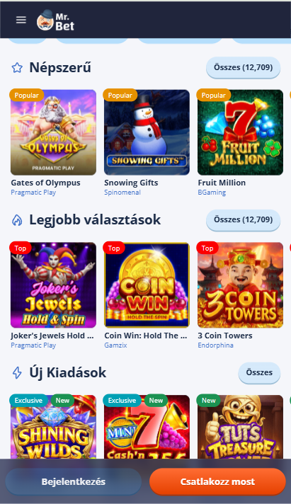 Ez a lista jól mutatja, hogy a Mr Bet nemcsak hagyományos gyümölcsös slotokat kínál, hanem modernebb mechanikákkal működő játékokat is.