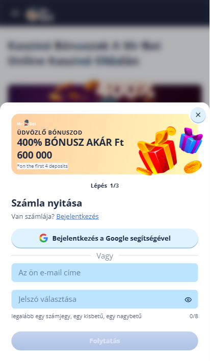 Fiók létrehozása. Nyissa meg a Mr Bet regisztrációs oldalát, adja meg az alapvető személyes adatokat, majd erősítse meg a fiók létrehozását.