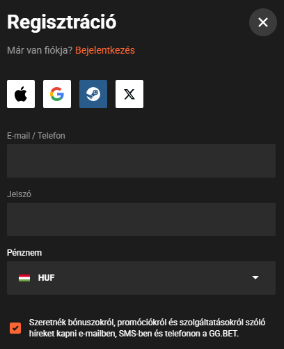 A GGBet oldalon többféleképpen is regisztrálhatsz – e-mailben, telefonszámon vagy közösségi hálózatokon/messengeren keresztül.