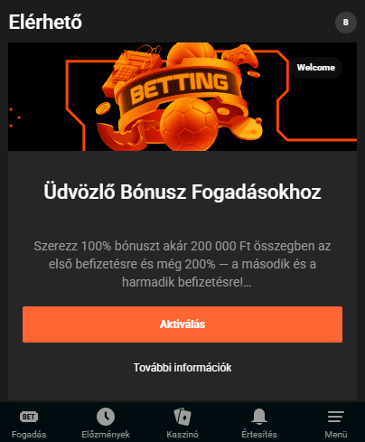 A fogadási bónusz helyett az első 4 befizetéshez használhatod a kaszinó üdvözlő bónuszcsomagját. Az ajánlat részeként a teljes befizetés összegének 550%-át, de legfeljebb 1 800 000 forintot kaphat. A csomag 275 ingyenes pörgetést is tartalmaz.