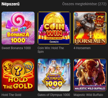 A kaszinó több mint 90 ismert szolgáltató játékait kínálja, köztük a Gamzixet, a Pragmatic Playt, az Evolutiont és a Betsoftot. A keresés megkönnyítése érdekében a játékok kategóriákba vannak osztva — népszerű, új, gyűjtemények (állatok, könyvek, jokerjátékosok, sárkányok, gyümölcsök, 777, Egyiptom stb.) és nyerőgépek. A Sweet Bonanza 1000, a Coin Win: Hold The Spin, a 4 Horsemen és a Hold The Gold napjaink legnépszerűbb játékai közé tartoznak. Azonnali játékok is elérhetők a kaszinóban. Ebbe a kategóriába tartoznak a Mines, Aviator, Crash X és Plinko Rush.