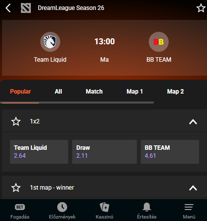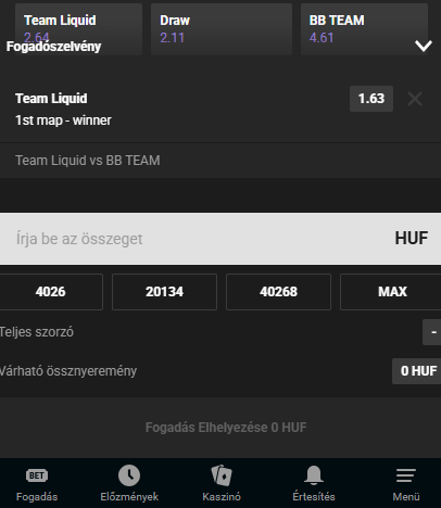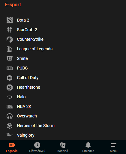 - Széles választék az eSporthoz kapcsolódó eseményekből, naponta több mint 200 fogadási mérkőzés jelenik meg