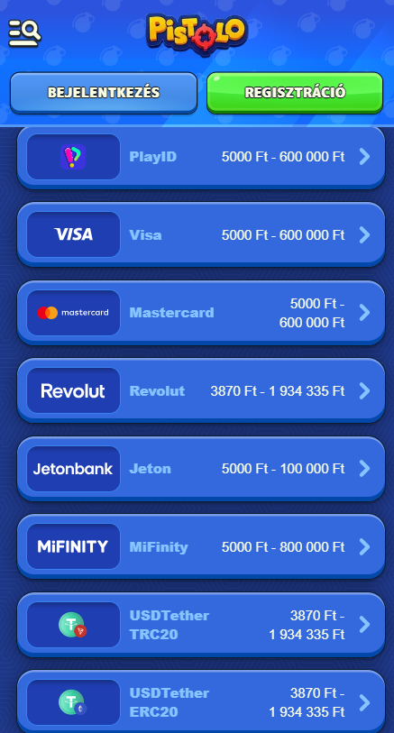 Érdekesség: A Pistolo minden befizetési módja szinte azonnali – a jóváírás rögtön megtörténik, amint a tranzakció sikeres. A legtöbb kriptós opció azonos limitekkel működik, így rugalmasan kezelheted az egyenlegfeltöltést. Ha Magyarországról játszol, érdemes a helyi megoldásokat, például a Revolutot vagy a Jetont választani. Ráadásul a kriptós befizetések már 380 Ft-tól elérhetők, ami lehetőséget ad arra, hogy kis összeggel is kipróbáld a játékot, felesleges kockázat nélkül.