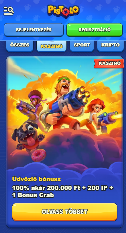 A Pistolo Casino egy 2025-ben indult, modern kriptokaszinó, ahol a játékosok gyorsan elérhetik a több mint 11 000 játékot és 700-nál is több élő asztalt. Letöltés nélkül lehet játszani, a kifizetések gyorsak, és a népszerű kriptovaluták is támogatottak. Az új játékosokat egy bőkezű üdvözlő bónusz várja – 100% akár 200 000 Ft-ig + 200 IP + 1 Bonus Crab. A legelső Pistolo vélemények szerint a platform színes, mobilbarát felülettel rendelkezik, és több nyelven kínál támogatást.