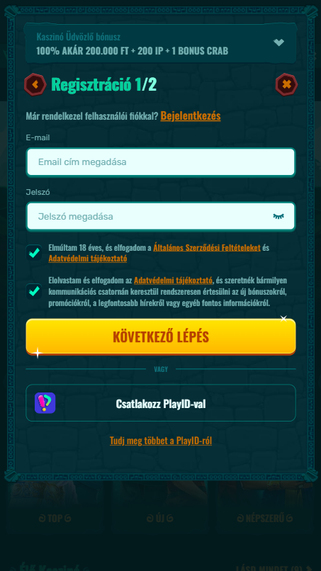 - Regisztrálj a kaszinóban, majd kattints a belépés gombra.