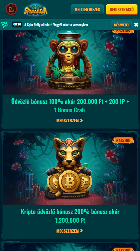 A Spinanga kaszinó új magyar játékosai egy igazán bőkezű kezdőcsomagot kapnak. Az üdvözlő bónusz 100% akár 200 000 Ft-ig, mellé 200 ingyenes pörgetés és 1 Bonus Crab is jár. Ez ideális indulás azoknak, akik szeretnének extra értékkel kezdeni a játékot. A bónusz automatikusan aktiválódik az első befizetés után, és kifejezetten nyerőgépeken használható fel.
