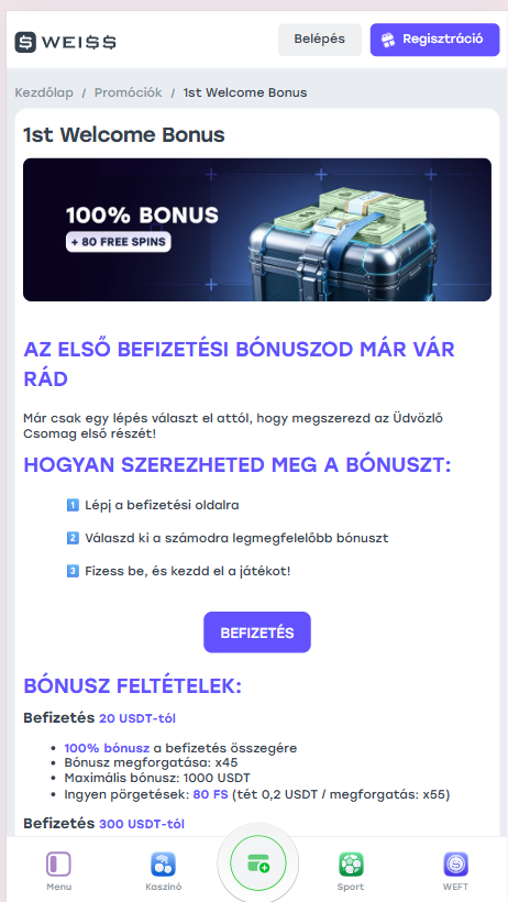 A Weiss Casino jól átgondolt bónuszrendszert kínál az új és a visszatérő játékosoknak. A középpontban az első befizetéshez kapcsolódó ajánlat áll, amely már a kezdetektől nagyobb játékkeretet biztosít. A bónusz USDT-ben kerül jóváírásra, de a magyar játékosok az egyenleget HUF-ban is megjeleníthetik.