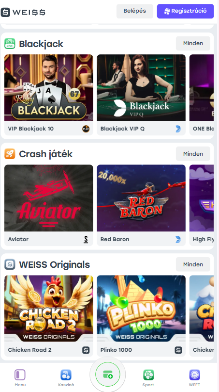 A 60+ fejlesztővel való együttműködés biztosítja, hogy a kínálatban megtalálhatók legyenek a klasszikus nyerőgépek, a modern Megaways slotok, a crash formátumok és az élő asztali játékok is. A több ezer kaszinó játékok között minden játékstílus képviselve van, így a Weiss Casino kiegyensúlyozott és versenyképes választékot kínál a magyar játékosok számára.